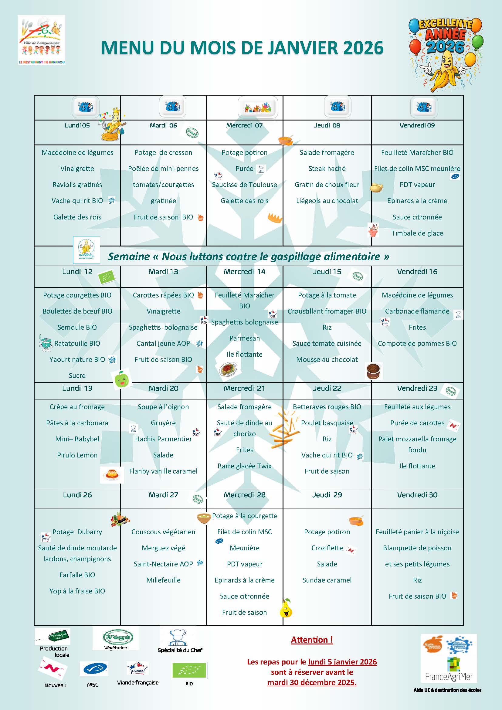Nous vous rappelons qu’il est obligatoire d’inscrire votre enfant (fiche de renseignement à compléter et à renvoyer par mail à restaurationscolaire@ville-longuenesse.fr) et de réserver les repas en avance.